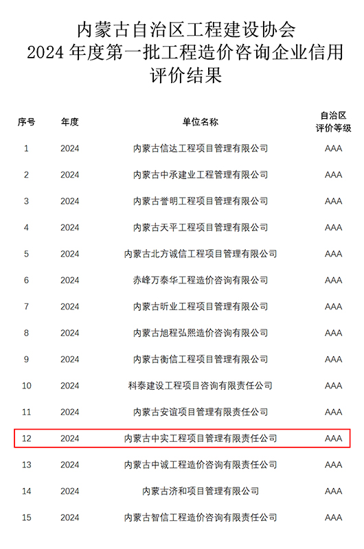 2024-07-3014999 次近期,我公司参加内蒙古自治区工程建设协会组织的“2024年度第一批工程造价咨询企业信用”申报,获得“信用AAA级证书”。我公司成立多年以来,遵循中国工程造价管理协会对造价咨询企…